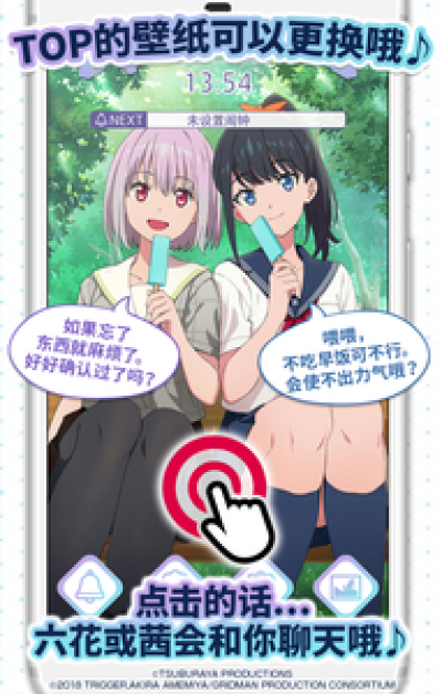2018年10月播出的高人气动画「SSSS.GRIDMAN(电光超人古立特)」中的两位女主角「宝多六花」(CV:宮本侑芽)和「新条茜」(CV:上田丽奈)的闹钟应用上线了!