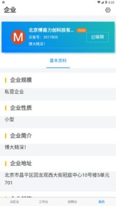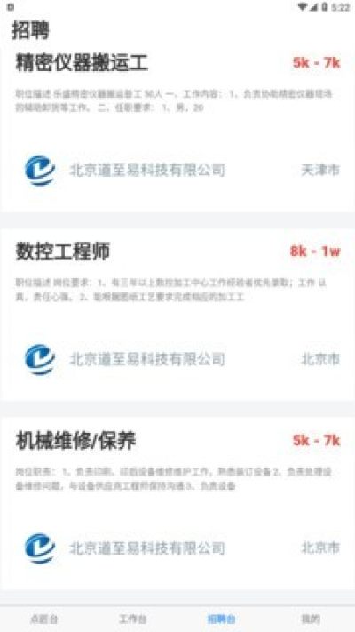 自由沃客APP共点匠台、工作台、招聘台、我的4个模块;