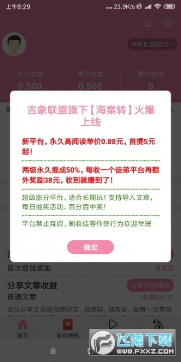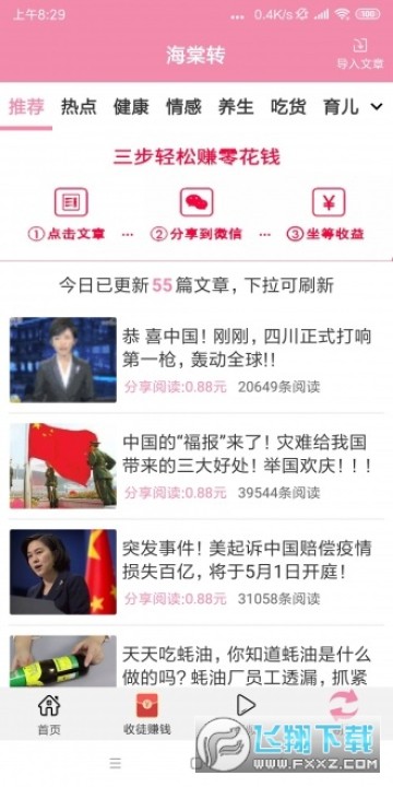 新用户下载安装就送1元,转发阅读单价全天0.88元/阅读,可导入文章,转发满5元可抽奖