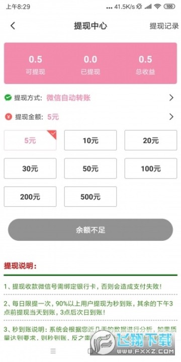 首次满5元提现,之后满10元提现,支持提现到微信上,提现最晚24小时内到账