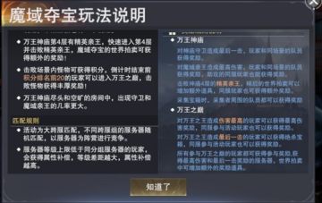 进入活动后,玩家可以击杀神庙守卫和亲王获取积分,队友击杀神庙守卫或亲王,其他队友也能获得奖励。积分争夺战倒计时结束后,积分榜前20名的玩家可进入万王之巅,挑战万王之王。在魔域夺宝活动中,不仅要注意怪物的袭击,也要提防其他服务器玩家的攻击。