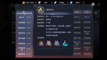 魔域夺宝是限时挑战活动,玩家可与其他服务器玩家一同进入魔域,争夺宝藏。每周一、周五晚8点30分,开放半小时,玩家等级要达到170级才可以参与。