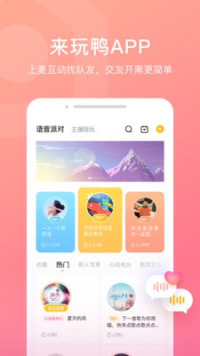 来玩鸭是一款语音互动交友软件,这里有高颜值高质量的主播和大神,提供贴心的约玩服务。在这里认识更多有趣的灵魂、心仪的大神、志同道合的陌生人陪你玩在一起,彻底消除孤单~