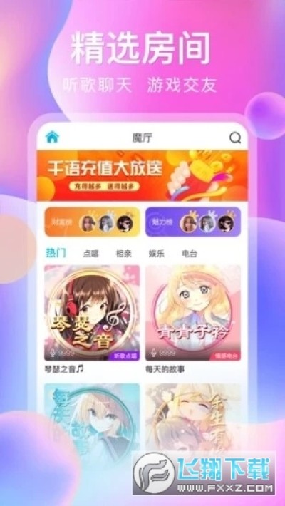 千语空间app是一款手机在线交友平台,这款软件是利用声音交友的,在千语空间app上用户可以在这里根据喜欢的声音到招呼,支持语音聊天,还有情感电台可以倾诉哦!