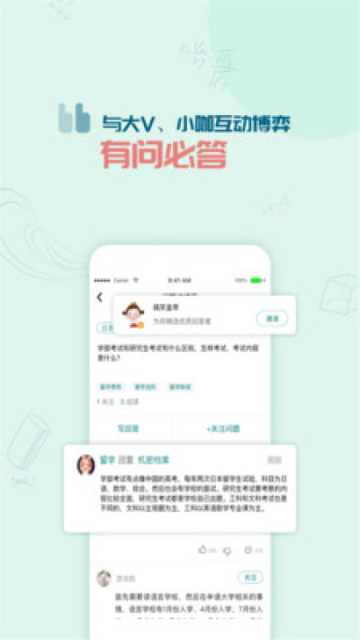和留学小伙伴交流留学信息,与好友分享海外资讯,寻找属于自己的留学攻略。直面大V、小咖,随时提问,发表看法,解决留学烦恼,来场思想的碰撞!