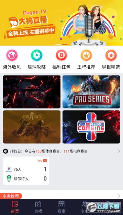 大狗直播app是一款全方位的手机直播平台,这款软件集合了各种体育赛事直播,还有电竞游戏赛事直播等等,在大狗直播app上可以观看最新的体育赛事直播,还有专家的点评信息等等!