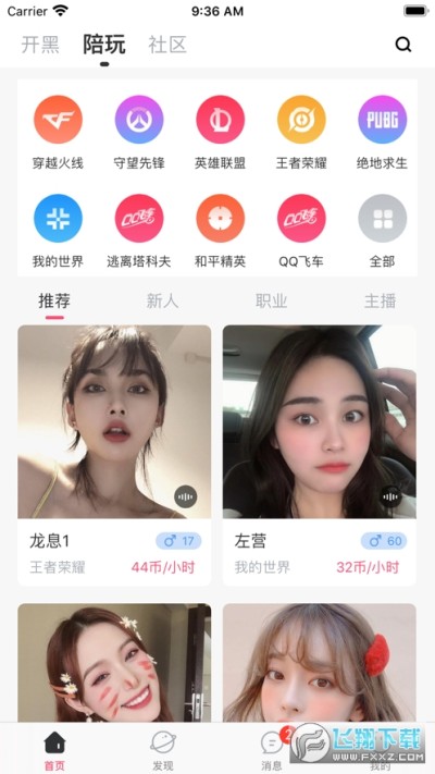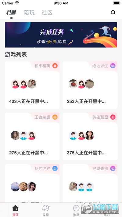 玩家进入首页可以选择开黑或者陪练模块,也可以进入社区浏览贴子。