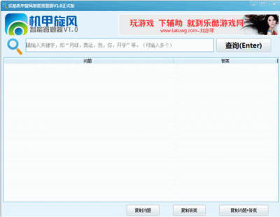 乐酷机甲旋风智能答题器是一款专门针对机甲旋风问题的答题工具,可以帮助帮助玩家们方便答题!只要在答题搜索框里输入问题相关的关键字词就可以找到对应的答案咯!