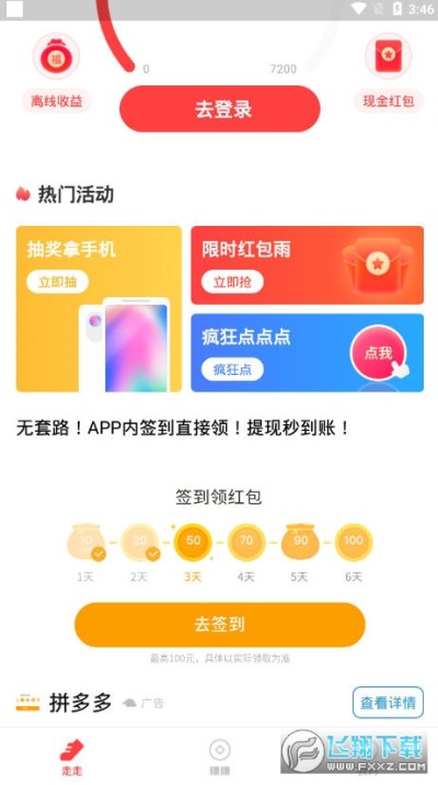 刷步app是一个能免费抽手机的赚钱软件,以走路赚钱为主,延伸了任务赚钱、红包雨福利、游戏赚钱等,离线也有收益哦,每天记得来收取首页的金币和现金红包奖励,一键轻松提现到账,快下载刷步app试试吧。