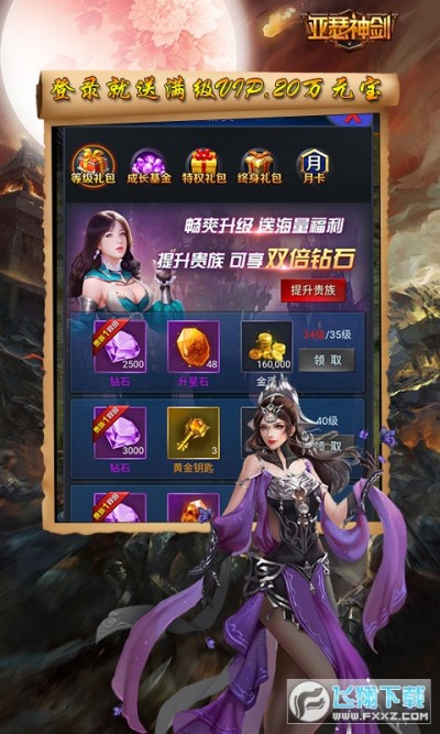 2,上线福利:上线送满V(VIP15),满V特权,钻石28888,金币500W(邮件领取);