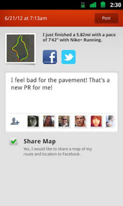 - 告诉大家你已开始跑步后,可听到 Facebook 上的朋友在你耳边加油打气。 标记 Facebook 上与你一起跑过步的朋友,并跟朋友和家人共享你的路线图。