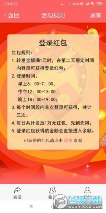 2、转发金额满1元时,在第二天规定时间内登陆可获得登陆红包,新上线期间分贝资讯每天发放一万元登陆红包,先到先得