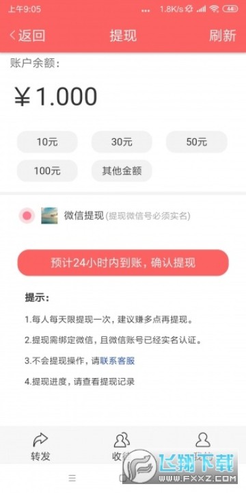 3、满5元提现秒到账,后续10元起提,每天每天限提1次。