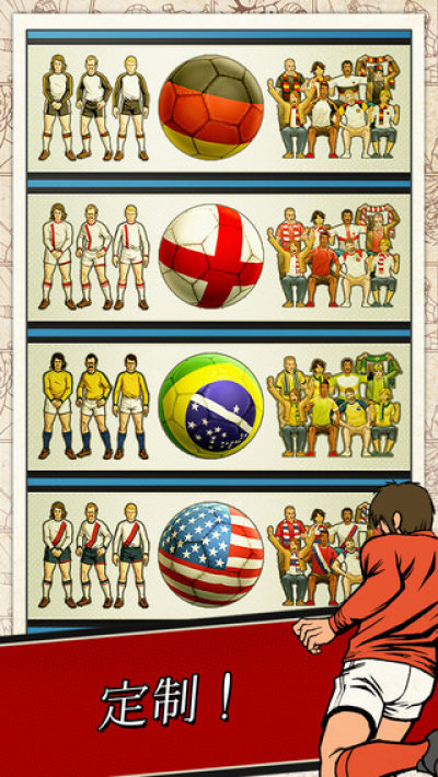 游戏画风精细复古,人墙队员都是纸片状移动,穿着打扮则是60年代世界杯的漫画感觉。游戏提供4种模式:教学、练习、技巧挑战以及双人同机竞赛。