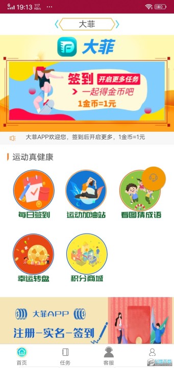 大菲APP一款全新上线的手机赚钱软件,新人注册并完成实名认证赠送8金币奖励,完成签到任务得1金币/天,后续完成成语猜猜乐、运动加油站等均可获得积分奖励,积分可以在商城内免费兑换各种实物好礼。