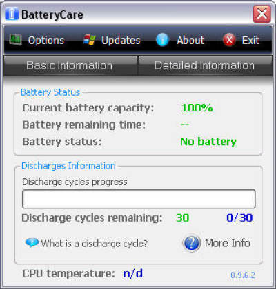 使用一个叫做BatteryCare的 免费软件可以很容易地监测和最大限度提高您笔记本电池的寿命。软件会像Windows电池监视器一样缩小在系统托盘中,但是当你的鼠标滑过它时会显示更多 有关电池的信息。