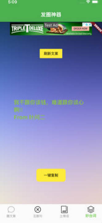 发圈神器app:随时在线利用手机发文案的软件,通过这款软件可以随时找到最新的文案进行发朋友圈,而且这些文案都可以一键在线生成,让大家随时在线生成各种所需人的文案,而且在这里只要你需要什么类的需求只需要在线搜索就可以快速生成哟,让你的朋友圈每天的文案都非常的有新鲜感,而且亮点也是十分的多哟。