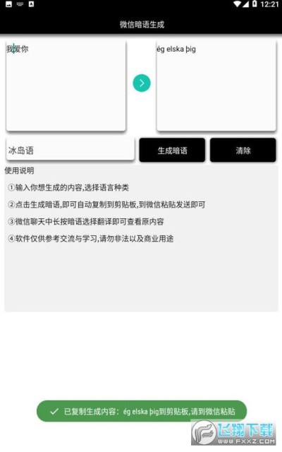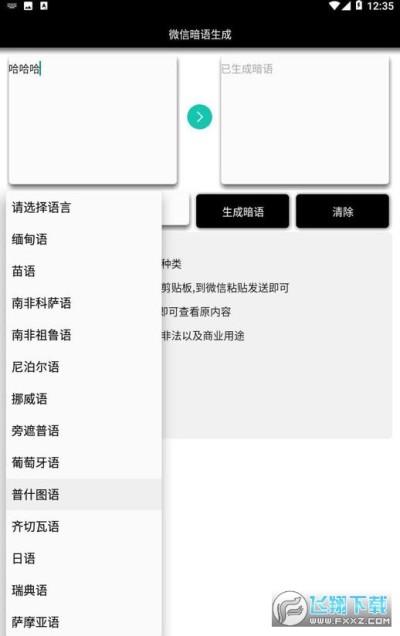 安卓一键生成微信暗语是一款可以帮助大家生成私密聊天暗语的工具,不让旁人看到,或者他人看懂,新增世界多国语言选择,输入你想要转换翻译的内容,即可一键生成暗语,有需要的朋友赶紧下载试试。