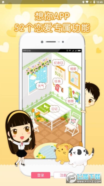 恋爱特供家具:游戏中心,日记本,地图,窗外天气,纪念日,相册,聊天.还可以打扮自己的卡通形象,随时亲亲抱抱,甜蜜互动.