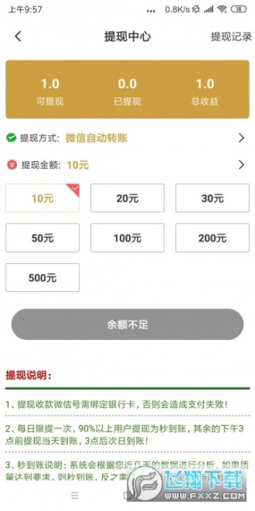 2、每日限提一次,90%以上用户提现为秒到账,其余的下午3点前提现当天到账,3点后次日到账!
