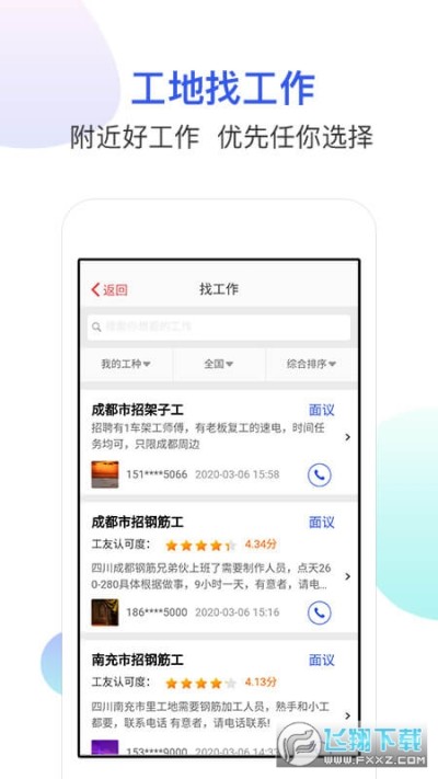 工地找工作官方app是款简单好用的手机找工作软件,通过我们的快捷下载用户们就能在线获取我们的工地信息和相关人员找工作的便捷服务。软件用法简单很是好用,需要的朋友不妨下载试试吧