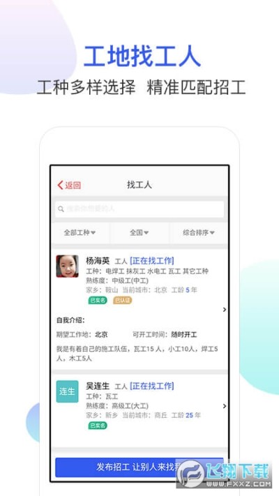 1、找活信息每天更新,根据工友设置的地域就近匹配,也可任意选择,城市选择具体到市级单位,工种选择覆盖全面