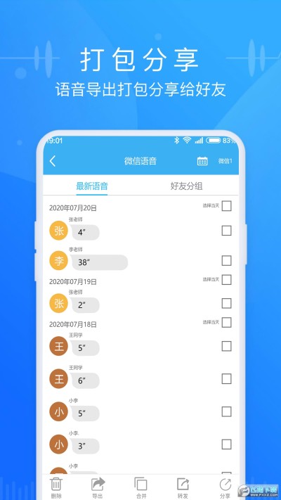 语音导出助手app是一款针对微信语音导出的软件,本站为大家带来的是免费版本,用户可以快速将自己的微信语音导出保存,也能合并语音,云端存储等等!