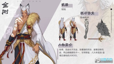 枪尊,因进化不完全,张着狼的耳朵,披着动物毛皮,两边眼睛颜色不一,非常野蛮,八大奇宝战追魂五星枪的大BOSS.