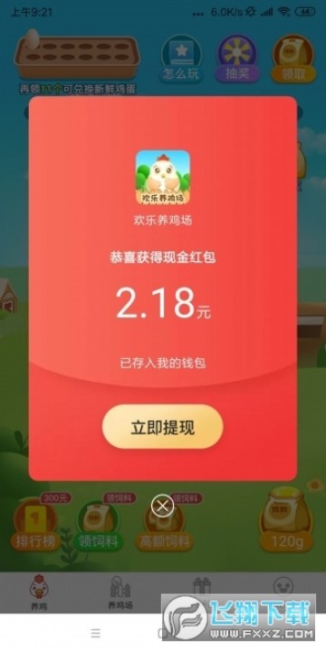 欢乐养鸡场APP一款经营类的赚钱小游戏,玩家可通过气泡、转盘、定时奖励、任务等都可以获得饲料奖励,得到的饲料可以给小鸡喂食,喂食一定的次数就可以领取鸡蛋和现金红包,红包最高50元,鸡蛋可兑换现金或兑换新鲜土鸡蛋直接包邮到家。