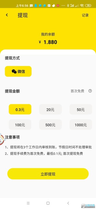 得到的奖励可以申请提现0.3元到微信,亲测秒到账,后续满20元提现。