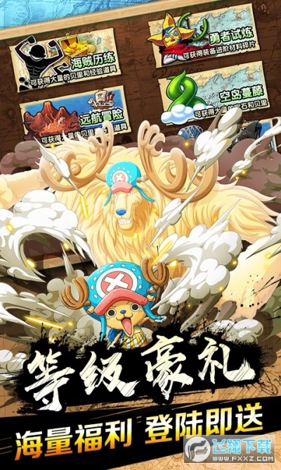 1、上线送SVIP1,,钻石88888,金币600w!登陆送新世界乔巴,黄金梅里号!