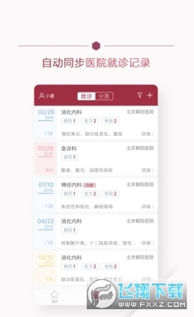 ↓ 患者安装并注册后,即可在软件中浏览自己在朝阳医院的就诊信息,包括病历、 处方、检验、检查等文字和影像资料,Android 和 iOS 系统的用户都可以安装哦!