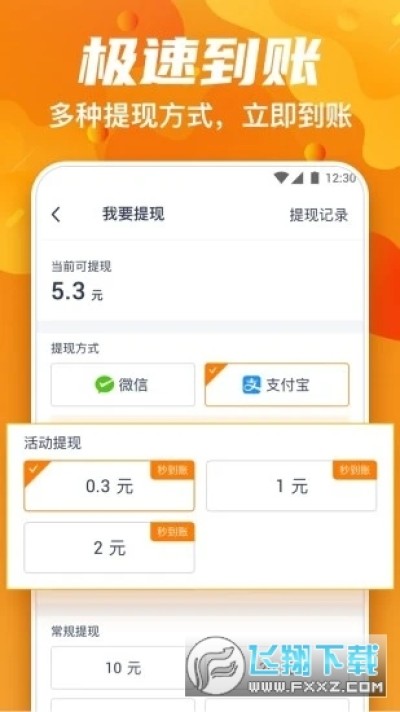 门槛低,0.3、1、2元多个极速提现档,闪电到账