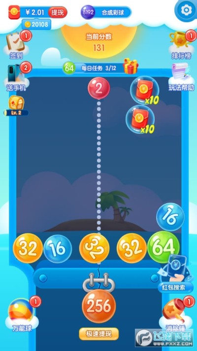天气球球红包版是一款类似2048的手机游戏,这款游戏就是选择球球下降合成更大数字的球球,游戏中可以随机获得红包奖励,还有手机碎片,集10个碎片就能抽华为p40手机了,红包还能直接提现,快来下载吧!
