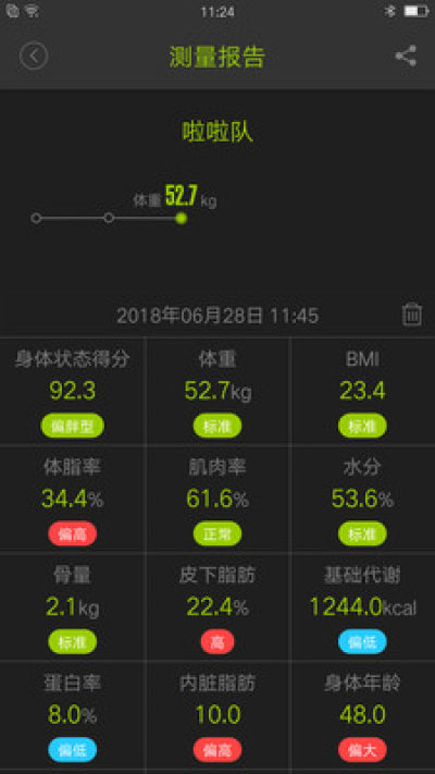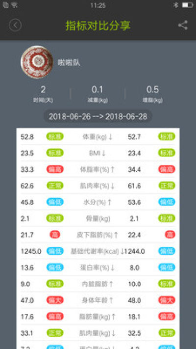 4、实时报告及阶段分析:根据个人目标及检测结果,提供个性化的减脂或增重建议,并提供阶段性分析报告。阶段曲线更可以让自己的阶段成果一目了然。