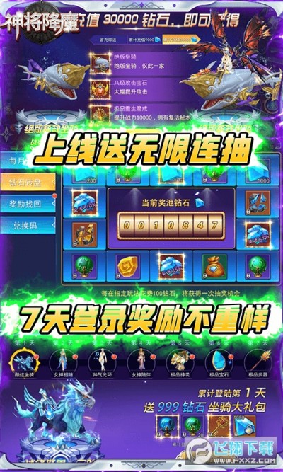 5、7天登录7天福利不重样,坐骑·冰锋怒兽,凯瑟琳女神,光环·幻影烁星,红色完美神装,红色完美神器全部来就免费送!
