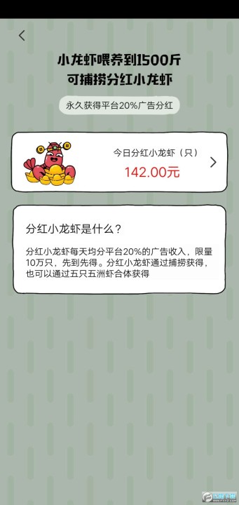 3、当小龙虾体重达到1500斤就能金币捕捞,可以获得分红小龙虾,每日获得150元分红;