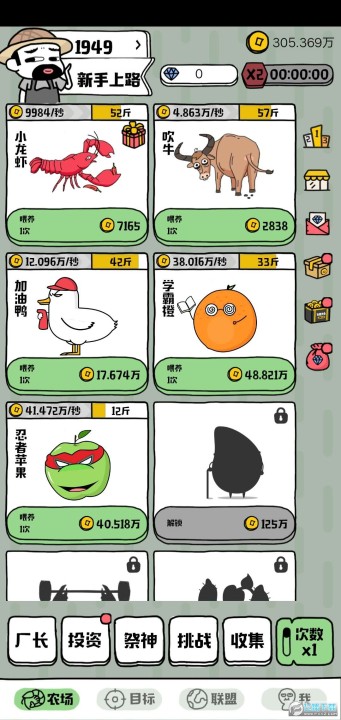 玩法很简单,就是看广告获得金币,金币喂养升级,平台主打经营策略,在此基础上增加了很多趣味玩法,比如说解锁农场、招募厂长、投资金币等。