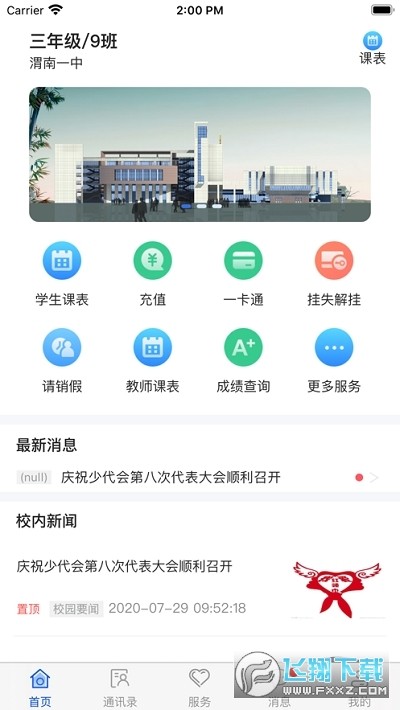 学生课表、充值、一卡通、挂失解挂、教师课表更多服务,可第一时间接收到系统推送的通知消息。