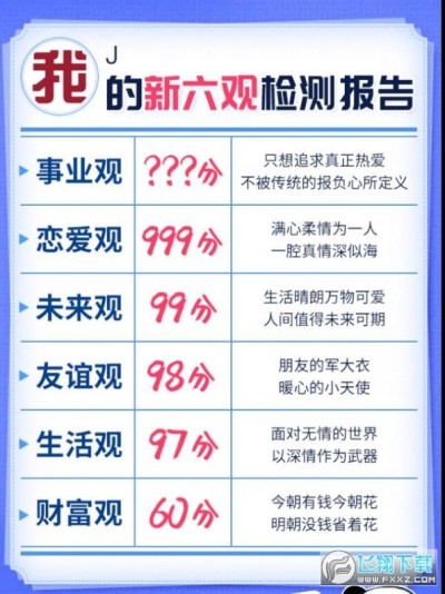 你的新六观检测报告安卓版是一款十分好用的在线测试类型的app软件,一个很有意思的测试,生成一个完整的事业观,价值观等等六关的一个评估,需要的小伙伴赶紧来下载这款你的新六观检测报告安卓版吧~