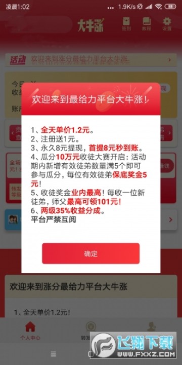 1、新用户下载注册大牛涨app即送1元,全天转发单价1.2元起