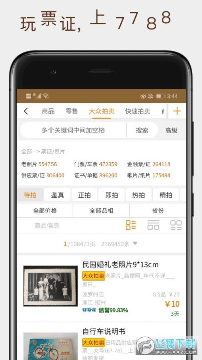 7788收藏app是一款由福州九九七七八八网络技术有限公司发行的收藏品软件,是专门用来收藏有价值的商品,经营范围是比较广的。是收藏品、工艺品、艺术品等的交易平台,包含零售、拍卖、批发、自由交易、定制等等交易模式,有近十万家商店(卖家),几百万会员(买家),每日实时在线人数达到10万以上。可以获得货真价实的商品。
