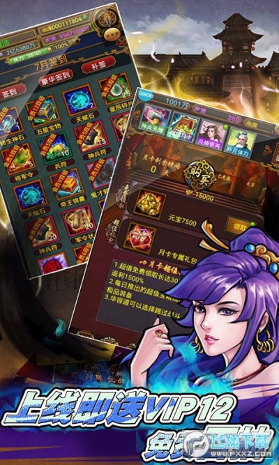 ★上线送VIP12、38888元宝、1000万银币、免费百连抽(邮件领取)