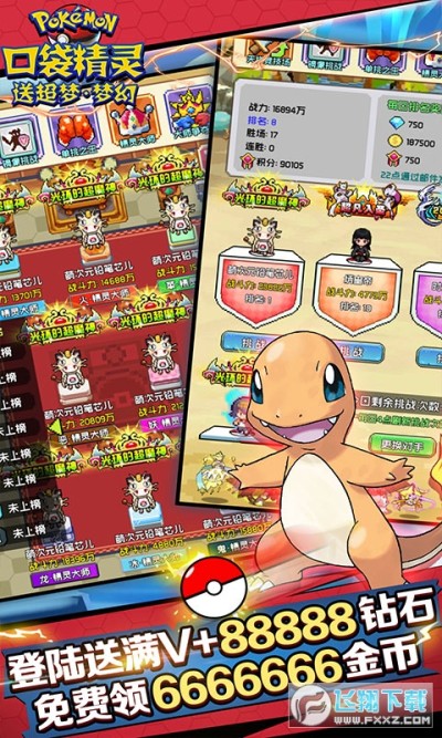 口袋精灵送超梦+梦幻是一款口袋妖怪题材手游,采用了GBA像素画风,超多的小精灵等你来收集,游戏支持自动寻路挂机,离线也有收益,玩家可以搭配不同的小精灵阵容组合来战斗!登录就送送超梦+梦幻,每天上线可以领5000钻石哦!升级超级快!