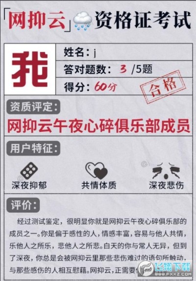 网抑云资格证考试官方版是一款可以帮助你测试自己是不是网抑云的软件,这里有非常多的题目都是可以提供给用户进行测试的,非常的方便,而且也是比较有趣的,让你打发无聊的时间,想要知道自己是不是网抑云的用户可以来这里感受一下的。