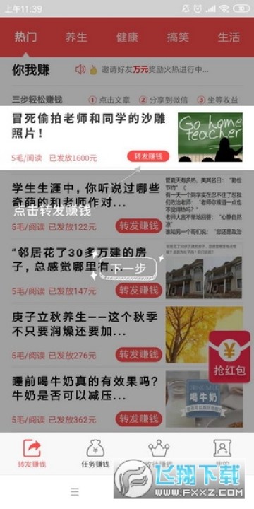 1、大家转发的新闻资讯每次点击5毛,被点击的阅读量越多收益就越多。