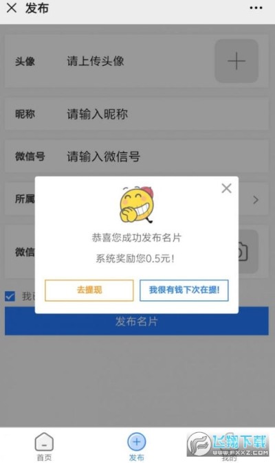 3.然后发布一次自己的名片,奖励0.5元,直接提现!