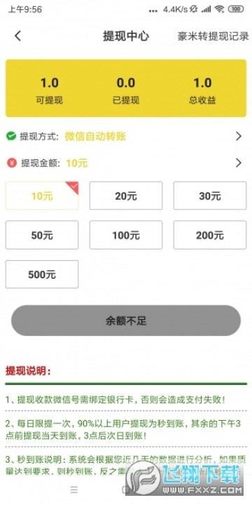 收益满10元起提现到微信钱包,90%以上用户为秒到账,其余的24小时内到账,每日限提一次