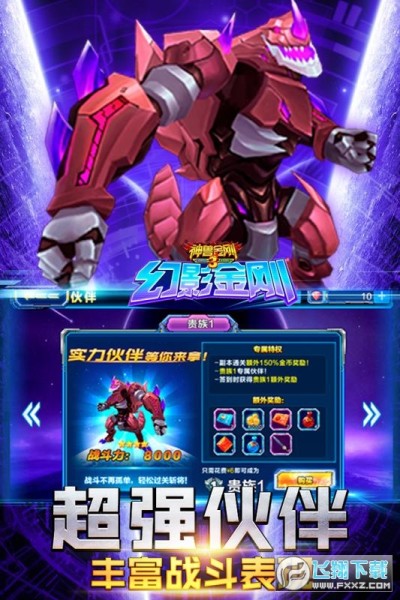 在游戏当中,幻影金刚有六个不同的星甲战士,拥有不同的特性,独特的技能,还可以不断的培养升级,强化角色能力,有六个超强的伙伴等待你的召唤,他们各怀强大武力。将成为你守护星球的最强大助力。