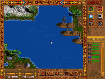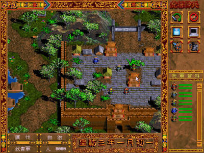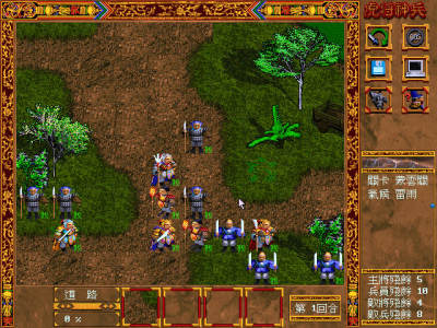 操作时用鼠标一点某主将,左下方出现了此主将的大头像和资料。在大地图上,可以用鼠标圈住队伍,使之朝着一个指定的地点移动(每10步一日)。还可以用一个省力的方法,那就是在地图的左下方有一个关卡指令,按下去会显示所有关卡地名的指令栏,在下一个要去的地名上按一下,部队就会被带到那一个关卡处,而不需要拉着整个队伍慢慢地移动了。